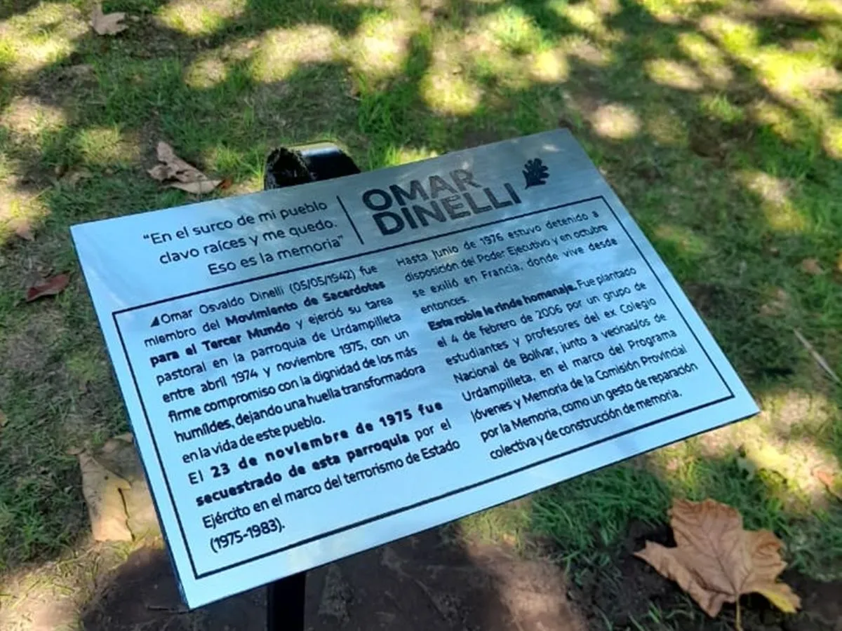 El último sábado, en la plaza ubicada frente a la parroquia de Urdampilleta, se volvió a colocar un cartel que señaliza el roble plantado en homenaje en vida a Omar Dinelli, quien hasta 1975 estuvo a cargo de la iglesia Cristo Rey de esa localidad y fue secuestrado por la Triple A.