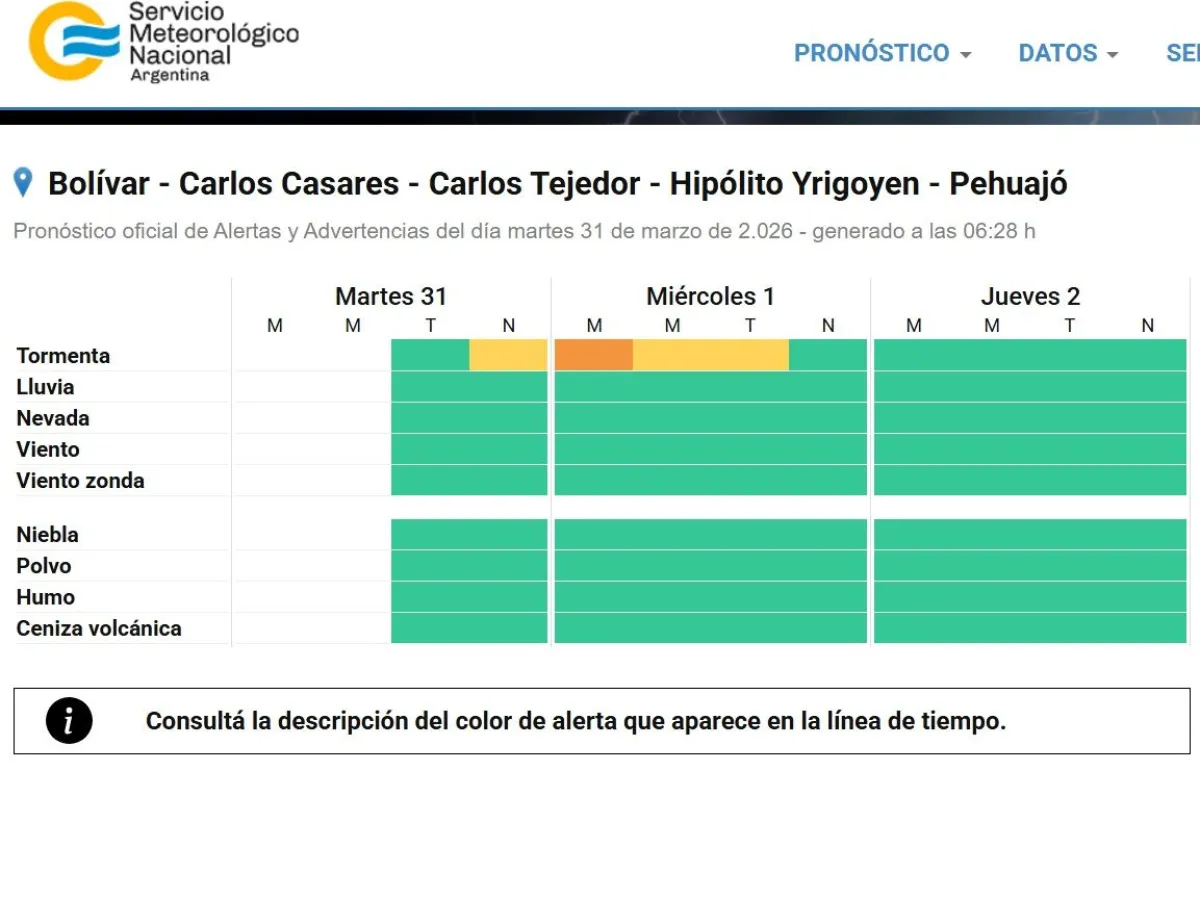 La zona que incluye a Bolívar, Carlos Casares, Carlos Tejedor, Hipólito Yrigoyen y Pehuajó podría verse afectada por fuertes tormentas desde la noche de este martes, según el sistema de alertas temprana que emitió el Servicio Meteorológico Nacional (SMN).