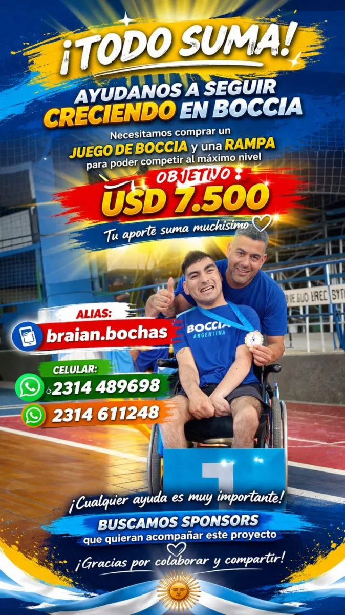 Como jugador de bc3, el deportista necesita un juego de boccia y una rampa para poder estar a nivel competitivo. El valor de esos materiales de alto rendimiento es de alrededor de 7.500 dólares y por eso surgió organizar la campaña solidaria, “para poder conseguir el equipamiento adecuado y estar al mejor nivel competitivo”.